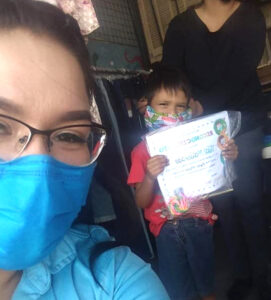 Maestra Alejandra con todas las medidas de seguridad visitó a sus alumnos en sus hogares para entregarles su diploma de fin de ciclo escolar.